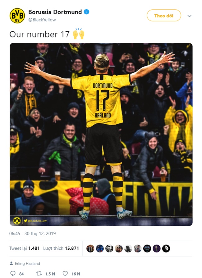 Được biết, trên trang Twitter chính thức, Dortmund đã đăng tải Haaland mặc áo số 17, kèm dòng trạng thái “Số 17 mới của chúng ta”. Đây không phải số áo đẹp nhưng trong tương lai, nếu vài trụ cột trên hàng công là Jadon Sancho hoặc Paco Alcacer ra đi, Haaland đương nhiên sẽ có cơ hội khoác lên mình số áo giá trị hơn.