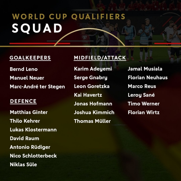Hansi Flick đã triệu tập nhiều cầu thủ quen thuộc và tương tự danh sách trước đây. Đây cũng là các gương mặt từng xuất hiện ở đợt đầu tiên mà HLV này nắm quyền dẫn dắt “Những cỗ xe tăng”. Danh sách chính thứ 23 cầu thủ tập trung ĐT Đức lần này: