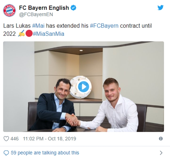 Cụ thể, đội bóng chính thức gia hạn hợp đồng với Lukas Mai đến năm 2022. Chỉ mới 19 tuổi, sao trẻ này được kỳ vọng trở thành nhân tố chính ở hàng thủ trong tương lai. Sau khi chuyển đến Allianz Arena từ Dynamo Dresden vào năm 2014, trung vệ người Đức đã có những màn trình diễn ấn tượng.