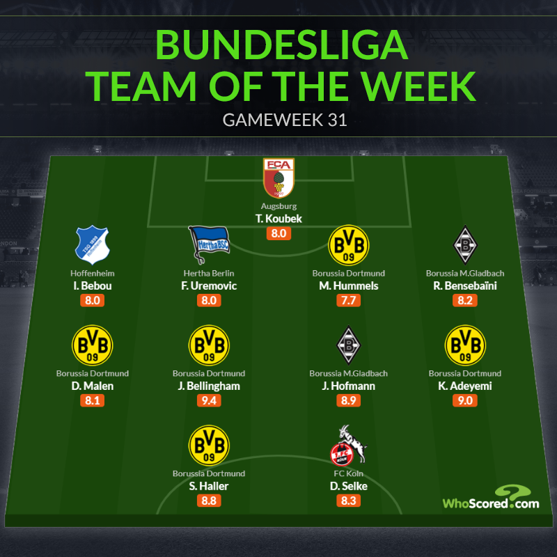 Cả 4 cái tên ghi bàn cho đoàn quân của HLV Edin Terzic, bao gồm Donyell Malen, Sebastien Haller, Karim Adeyemi (cú đúp) và Jude Bellingham (cú đúp) do đó đều được trang Whoscored bầu chọn vào đội hình tiêu biểu tuần.
