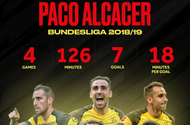 Tuy nhiên, thành tích mà Alcacer tạo lập trong màu áo Dortmund mới là điều khủng khiếp. Theo thống kê, anh đã ghi đến 7 bàn thắng chỉ trong 4 trận đấu (126 phút) tại Bundesliga. Tính ra, tiền đạo này có được một pha lập công sau mỗi 18 phút xuất hiện trên sân.
