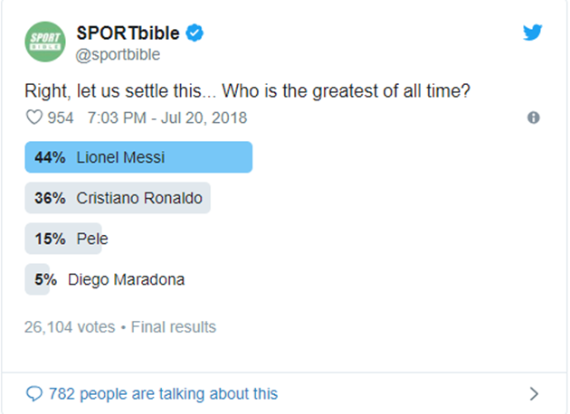 Vừa qua, SPORTbible đã mở cuộc bình chọn trên Twitter để tìm ra cầu thủ xuất sắc nhất mọi thời đại do người hâm mộ bình chọn.
