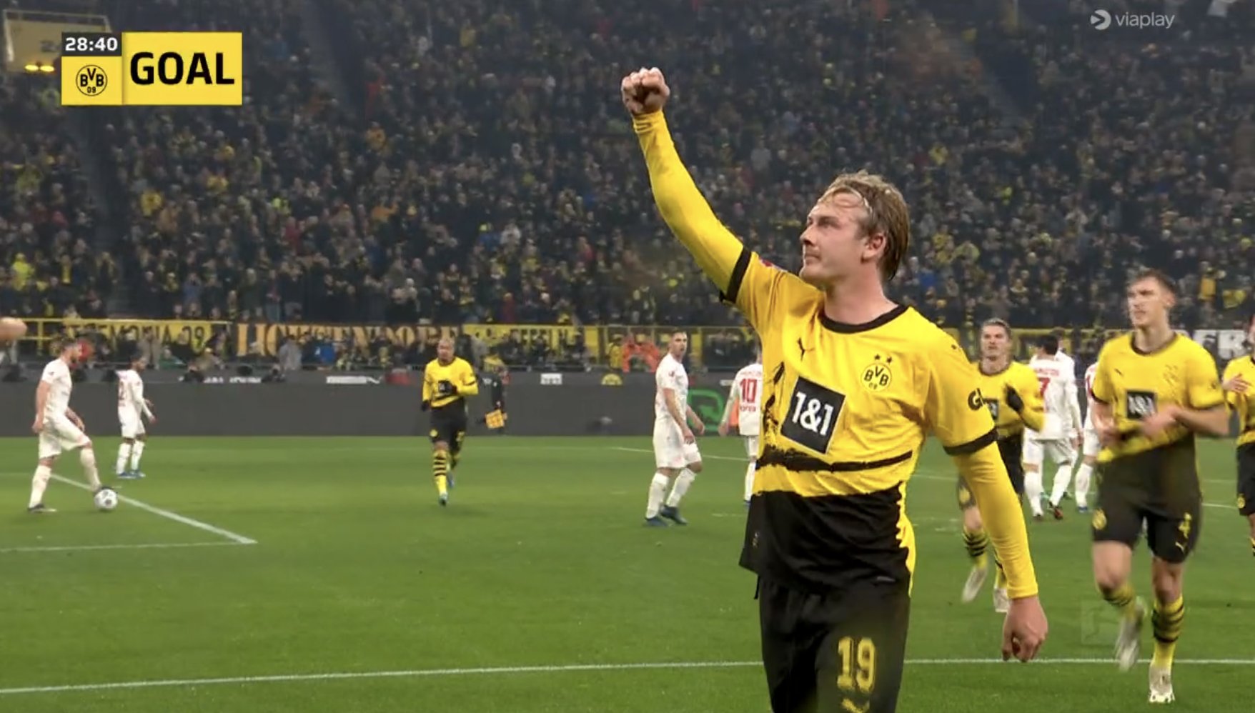Trong thế trận như thế, Dortmund có bàn mở tỷ số ở phút 29. Từ tình huống đá phạt trực tiếp, Julian Brandt vẽ một đường cong tuyệt đẹp khiến thủ thành Mainz chỉ còn biết chôn chân vào lưới nhặt bóng.