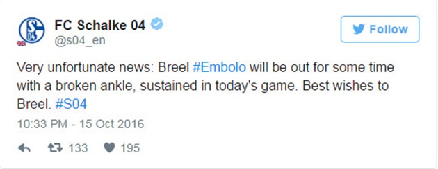 Trang chủ Schalke xác nhận thông tin tiền đạo Breel Embolo sẽ phải nghỉ thi đấu dài hạn vì bị gãy xương mắt cá chân trong trận hoà giữa đội bóng này với Ausburg. Embolo chỉ thi đấu 24 phút trên sân trước khi có va chạm mạnh với trung vệ Konstantinos Stafylidis bên phía Ausburg. Embolo đổ vật xuống sân đau đớn và nhanh chóng được đội ngũ y tế đưa ra ngoài sân và lập tức chuyển thẳng đến bệnh viện. Tiền đạo Klass-Jan Huntelaar là người vào sân thay thế.