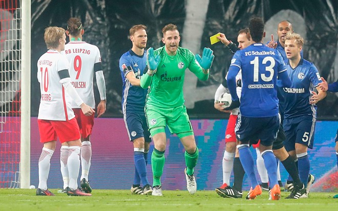 Trọng tài rút thẻ vàng phạt thủ môn Schalke. Các cầu thủ khách phản ứng rất quyết liệt.