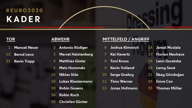Về các số áo khác, mọi thứ không bất ngờ. Neuer vẫn mặc áo số 1. Số 8 thuộc về Toni Kroos, Joshua Kimmich khoác áo số 6 hay Timo Werner chọn chiếc áo số 11.
